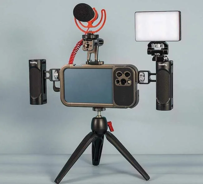 Un exemple de configuration professionnelle autour d’un iPhone : trépied, poignées, lumière et micro © Smallrig